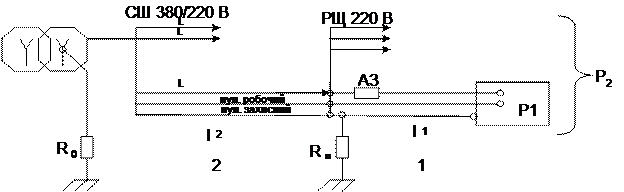 Тр - масляний трансформатор, що понижує напругу з U1 = 6-10 кВ до U2 = 380 В; схема з¢ єднання обмоток зірка-зірка; ЗШ - збірна шина; РЩ - розподільний щит; АЗ - апарат захисту; 1 - лінія, що живить електроустановку потужністю Р1; 2 - живильний магістральний кабель. Мета розрахунку - визначення такого перерізу нульового захисного провідника, при якому струм короткого замикання (ІК) у задане число разів (К) перевищить номінальний струм апарату захисту (ІАЗном), що забезпечить селективне відключення споживача, тобто повинна виконуватися умова: ІК≥ К∙ ІАЗном. (1) Згідно НПАОП 0.00-1.28-10, електромережа, що живіть ЕОМ та інші однофазові електроустановки, виконується як групова трипровідна лінія шляхом прокладання фазового, нульового робочого і нульового захисного провідників з міді або алюмінію. Якщо кількість ЕОМ не перевищує 5 і вони розташовані по периметру приміщення, кабель в оболонці з неспалених матеріалів прокладають по підлозі вздовж стін. Якщо кількість ЕОМ перевищує 5 або вони розташовані у центрі приміщення, кабель прокладають у металевих трубах та гнучких металевих рукавах з відводами.