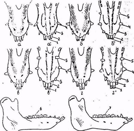 Рис. I Возрастные изменения на зубах у свиньи: а - резцы и клыки молочные, возраст 6 месяцев (вид снаружи); а - то же (вид со стороны рта); б - клыки и окрайки сменились на постоянные, возраст 7-8 месяцев (вид снаружи); 6 - то же (вид со стороны рта); в - зацепы сменились на постоянные, возраст 12-13 месяцев (вид снаружи); в' ~ то же (вид со стороны рта); г - сменились на постоянные средние резцы, возраст 18 месяцев (вид снаружи); г' - то же (вид со стороны рта); д - ветвь нижней челюсти молодняка; е - то же взрослой свиньи; I - зацепы; 2 - средние; 3 - окрайки; 4 - клыки; 5 - волчий зуб; 6 -третий премоляр трехскладчатый; -7 - то же двухскладчатый.