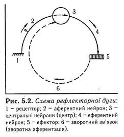 Рецептори - це чутливі структури, які сприймають зміни зовнішнього або внутрішнього середовища. Сукупність рецепторів, подразнення яких викликає певний рефлекс, називається рецепторним полем рефлексу. В рецепторному полі можуть знаходитись різні за функцією рецептори. Наприклад, згинальний рефлекс можна викликати подразненням як тактильних рецепторів шкіри, так і пропріорецепторів м'язів. Аферентний шлях формується чутливими нервами, які приносять збудження від рецепторів у центральну нервову систему. Ці нерви називають доцентровими. Нервовий центр рефлекторної дуги являє собою скупчення нейроцитів на певному рівні центральної нервової системи. В ньому відбувається обробка інформації, що надходить від рецепторів, про зміни середовища. Нервові центри можуть бути розміщені на будь-якому рівні центральної нервової системи. Залежно від цього, розрізняють наступні рівні регуляції: спінальний, бульбарний (довгастий мозок), мезенцефальний (середній мозок), діенцефальний (проміжний мозок), мозочковий, стріопалідарний (базальні ядра мозку), кірковий (кора великих півкуль). Еферентний шлях являє собою або рухові, або вегетативні нерви. По ньому передається збудження від центральної нервової системи до робочого виконавчого органа. Ефектор, або робочий орган, отримує збудження-" наказ", що надійшов із центру, і здійснює або, навпаки,, припиняє виконання роботи. Ефектором можуть бути скелетні та гладкі м'язи, серцевий м'яз, залози. У будь-якій рефлекторній дузі розрізняють зворотний зв'язок. Це аферентне волокно йде від ефектора до нервового центру. По зворотному зв'язку ефектор сповіщає центр, чи виконаний " наказ", що прийшов із центру. Таким чином, завдяки зворотному зв'язку, рефлекторна дуга замикається в рефлекторне кільце. Необхідною умовою для здійснення рефлексу є цілісність усіх ланок рефлекторної дуги. Найпростіша рефлекторна дуга - моносинаптична (проста), тобто має лише два нейрони в центрі: аферентний, з якого збудження відразу переключається через синапс на еферентний. Прикладом моносинаптичних рефлексів є сухожилкові рефлекси: колінний, ліктьовий, ахілів, які мають важливе клінічне значення. Якщо в нервовому центрі рефлекторної дуги є кілька послідовних нейронів (вставних), з'єднаних синаптичними контактами, тоді рефлекторна дуга називається полісинаптичною (складною). За характером реакції розрізняють рухові (ефектор - скелетні м'язи) і вегетативні (ефектор - внутрішні органи, судини, залози) рефлекси. Вивчення рефлексів людини (наприклад, сухожилкових, зіничних, шкірних тощо) має велике клінічне значення, оскільки дає можливість встановити наявність тих чи інших уражень в центральній нервовій системі. На розрізі мозку видно, що він складається із сірої та білої речовин. Сіра речовина - це скупчення тіл нервових клітин. Окремі ділянки скупчень сірої речовини, які виконують одну функцію, називають ядрами. Біла речовина представлена нервовими волокнами. Нервові волокна в головному і спинному мозку утворюють провідні шляхи. Периферичні нерви, залежно від того, з яких волокон (чутливих чи рухових) вони складаються, діляться на чутливі, рухові та змішані. Тіла нейронів чутливих нервів лежать в нервових вузлах поза мозком. Тіла рухових нейронів лежать у передніх рогах спинного мозку або рухових ядрах головного мозк