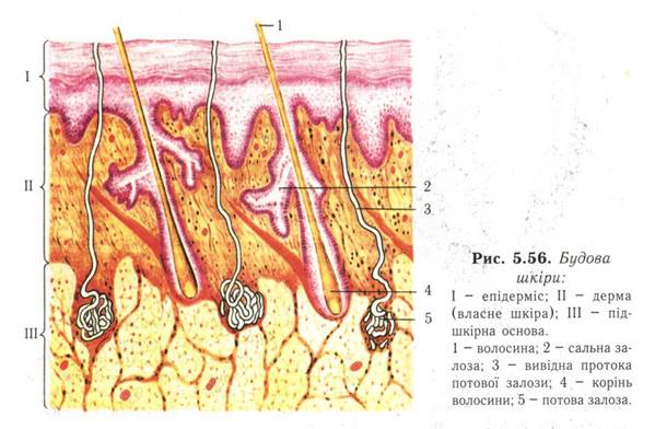 Шкіра людини складається із двох шарів (рис. 5.56): 1. Епідерміс - поверхневий шар, що побудований із зроговілого багатошарового плоского епітелію. 2. Власне шкіра - глибокий шар - дерма побудований із волокнистої сполучної тканини, незначної кількості еластичних та непосмугованих м'язових волокон. Власне шкіра має два шари: верхній щільний та нижній. Верхній щільний шар (сосочковий) вдається в епідерміс і утворює сосочки, всередині яких проходять кровоносні та лімфатичні капіляри, нервові закінчення. Сосочки на поверхні шкіри утворюють своєрідний рельєф у вигляді гребінців і борозенок. На гребінцях відкриваються отвори потових залоз. На долоні і підошві гребінці та борозни утворюють складний малюнок, притаманний лише певному індивідууму. Це використовують у кримінології та судовій медицині для визначення особи, якщо у неї попередньо були взяті відбитки пальців (тобто проведена дактилоскопія). Нижній шар переходить у підшкірну основу, яка представлена пухкою сполучною тканиною з жировими клітинами. Жирова клітковина бере участь у терморегуляції. В тих ділянках, які зазнають великого тиску (підошва - при стоянні, сідниця - при сидінні), підшкірний жировий шар розвинутий досить добре у вигляді еластичної підстилки. Колір шкіри залежить від кількості пігменту (меланіну), що знаходиться в глибокому шарі епідермісу. Похідні шкіри Похідними шкіри є волосся, нігті, сальні, потові та молочні залози. Волосся є похідним епідермісу. В ньому розрізняють стрижень, який знаходиться над поверхнею шкіри, і корінь. Останній закінчується розширенням - волосяною цибулиною, за рахунок якої росте волосся. Корінь знаходиться у товщі шкіри в сполучнотканинній сумці, в яку відкривається протока сальної залози. Колір волосся залежить від наявності пігменту. При зникненні пігменту і появі повітря у товщі волосся воно стає сивим. Нігті - це рогова пластинка, яка лежить в сполучнотканинному нігтьовому ложі. В нігті розрізняють корінь, що знаходиться в нігтьовій щілині, тіло і вільний край, який виступає за межі нігтьового ложа. Сальні залози знаходяться між двома шарами дерми, їх протоки відкриваються у волосяний мішечок. Там, де немає волосся (перехідна частина губ, головка статевого члена), протоки сальних залоз відкриваються безпосередньо на поверхню шкіри. На долонях і підошвах сальні залози відсутні. Шкірне сало змащує шкіру, волосся і захищає їх від надмірної вологи, мікроорганізмів. Потові залози розташовані в глибокому шарі дерми, їхні протоки відкриваються на поверхні шкіри. Потові залози разом із водою виділяють продукти обміну речовин: сечовину, деякі солі, сечову кислоту, їх багато в пахвовій та пахвинній ділянках. Молочна залоза (татта) - парний орган, за походженням є видозміненою потовою залозою, знаходиться на рівні від III до VI ребра на фасції, що покриває великий грудний м'яз. У дитячому віці молочна залоза недорозвинена, а у чоловіків вона залишається такою протягом усього життя. У жінок в період статевого дозрівання починається її інтенсивний розвиток. Це пов'язано з гормональною функцією яєчників. У клімактеричному періоді (45-55 років), коли гормональна діяльність яєчників послаблюється, залозиста тканина залози замінюється жировою. У період статевої зрілості молочна залоза у жінок складається з 15-20 часток, що подібні на маленькі з