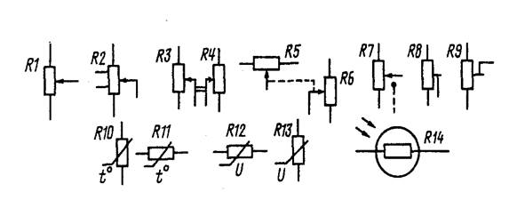 Рис.6. Условные графические обозначения регулируемых, подстроечных и полупроводниковых резисторов: R1- без дополнительных отводов; R2-с двумя дополнительными отводами; R3 и R4, R5 и R6-сдвоенные переменные резисторы; R7-совмещенный с выключателем; R8 и R9-подстроечные; R10 и R11-терморезисторы, или термисторы; R12 и R13-варисторы; R14-фоторезистор
