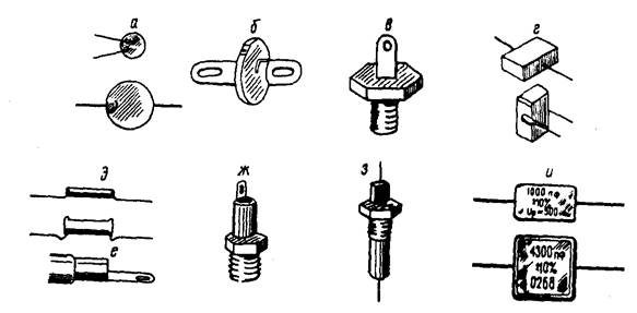 Рис. 8. Внешний вид конденсаторов постоянной емкости: а – КД-1, КД-2, КДС; б – КДУ; в – опорные КДО-1, КДО-2; г – КЛС; д – трубчатые КТ-1, КТ-2; е – КТ-3; ж – опорные КО-1, КО-2; з – проходной КПТ; и - слюдяной КСО