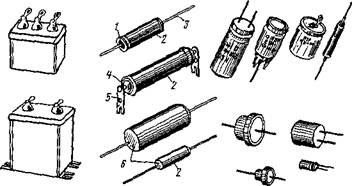 Рис. 9. Внешний вид бумажных и электролитических конденсаторов: 1— резиновый изолятор, 2 — корпус, 3 -- вывод, 4 — стеклянный изолятор, 5 — контактный лепесток, 6 — эпоксидный компаунд