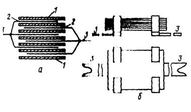 Рис. 10. Устройство слюдяного конденсатора: а – схема сборки; б – собранный пакет (1 – слюдяные пластины, 2 – фольга, 3 – выводы)