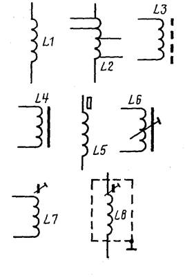 Рис.20. Условные графические обозначения катушек индуктивности и дросселей L1 – без отводов, L2 - с отводами; L3 - с магнитодиэлектрическим сердечником; L4 - с ферритовым и ферромагнитным сердечником; L5 - с диамагнитным (медь, алюминий, латунь) сердечником; L6, L7 - с изменяющейся индуктивностью; L8 - помещенной в экран