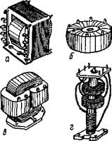 Рис. 21. Трансформаторы: а — низкочастотные с наборным броневым сердечником; б — тороидальным сердечником; в — с ленточным разрезным сердечником, г — промежуточной частоты с сердечником; д — высокочастотные без сердечника