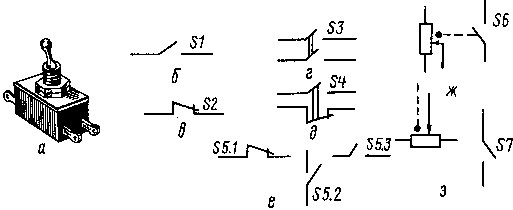 Рис. 23. Выключатели (тумблеры) и их условные графические обозначения