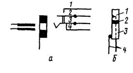 Бывают многопозиционные переключатели, в которых контакты замыкаются в зависимости от положения ручки. На схемах символы неподвижных контактов таких переключателей располагают в ряд по вертикали, а коммутацию их обозначают вертикальными отрезками с точками на концах. Так, в переключателе, условное графическое обозначение которого приведено на рис. 27 в, в положении 1 замкнуты между собой контакты А и Б; 3 — Б, В и Г, Д; 3 - А и Г; 4 — А, В и Г, Д; 5— Б и Г; 6— А, Б и В, Д. В радиоаппаратуре применяются и переключатели, представляющие собой гнездо с находящейся рядом с ним контактной группой (рис. 28 а). В исходном положении контакты 3 и 4 замкнуты, а 1 и 2 — разомкнуты. Если в гнездо вставить штырь (штекер), то, действуя на изгиб подвижного контакта 3, он перемещает его вверх вместе с механически связанным с ним контактом 2. При этом контакты 3 и 4 размыкаются, а контакты 1 и 2 — замыкаются. Штекер в таких переключателях может состоять из металлического наконечника 1 и полого стержня 3, изолированных друг от друга и снабженных гибкими выводами (рис. 28 б).