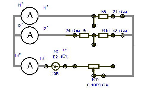 7.3.4. Э.д.с. источника Е2 установить порядка (45-55)В. Значения токов I1¢ , I2¢ , I3¢ , I1¢ ¢ , I2¢ ¢ , I3¢ ¢ записать в таблицу 7.2. 7.3.5. Значения внутренних сопротивлений r01 и r02, сопротивлений резисторов взять R1, R2, R3 из лабораторной работы № и записать в таблицу 7.2. 7.3.6. Собрать и изучить схему электрической цепи (рис. 7.2.).