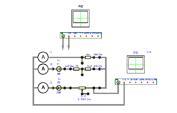 9.3.5. Вольтметром V1 измерить напряжение на резисторах R8, R9-10, и R13 (R13). 9.3.6. Э.д.с. источника Е2 установить порядка (45-60)В. 9.3.7. Значения внутренних сопротивлений r01 и r02, взять из лабораторной работы № 9.3.8. Результаты наблюдений записать в таблицу 9.