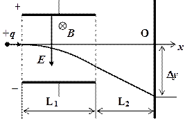 ДЗ 11.1. Конкурсные и олимпиадные задачи по теме «Магнетизм». Задание выполняется в тетради в клеточку (не менее 18 листов). Решение каждого задания начинается с нового листа. Обязательно перед началом решение должно быть записано (или приклеено) полное условие задачи. Следует также оставить место для замечаний преподавателя и записи нового решения. Должна соблюдаться заданная последовательность заданий. Если вы не смогли решить какую-либо задачу, то все равно нужно выписать ее условие и оставить место (хотя бы 1 страницу) для последующего решения. Все решения должны быть записаны аккуратно с подробными пояснениями и, там где необходимо, рисунками. Тождественные решения, а также решения с одинаковыми ошибками считаются списанными; за них ставится 0 баллов. Срок выполнения задания. 23 сентября – 7 октября (14 дней). 1. Пучок однозарядных ионов гелия и неона попадают в область пространства, где имеется однородное электрическое поле с напряженностью E = 100 В/м и однородное магнитное поле с индукцией B = 0, 01 Тл. Векторы E и B направлены под прямым углом друг к другу, и оба перпендикулярны пучку. Ионы проходят эти скрещенные электрическое и магнитное поля без отклонения и проникают в область однородного магнитного поля с индукцией B 1 = 0, 1 Тл, направленной перпендикулярно направлению движения ионов. На каком расстоянии друг от друга ионы гелия и неона окажутся, пройдя половину окружности? Силами кулоновского взаимодействия между ионами в пучке пренебречь. (2004). 2. Заряженная частица попадает в среду, где на нее действует сила сопротивления, пропорциональная скорости. До полной остановки частица проходит путь s = 10 см. Если в среде имеется магнитное поле, перпендикулярное скорости частицы, то она при той же начальной скорости остановится на расстоянии L1 = 6 см от точки входа в среду. На каком расстоянии L2 от точки входа в среду остановилась бы частица, если бы индукция магнитного поля была в два раза меньше? (2001). 3. В объеме плоского конденсатора созданы взаимно перпендикулярные электрическое и магнитное поля с напряженностью E и индукцией B такими, что пучок заряженных частиц движется вдоль оси x до центра O экрана Э прямолинейно. При выключении магнитного поля след пучка на экране сместился на величину D y (см. рис.). Считая известными расстояния L 1 и L 2, определите отношение заряда частицы к его массе (удельный заряд частицы). Силу тяжести не учитывать. (2004).
