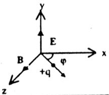 Рис. к зад. 3. 4. Пучок протонов движется прямолинейно в области, где созданы однородные взаимно перпендикулярные электрическое поле с напряженностью E и магнитное поле с индукцией B. Траектория протонов лежит в плоскости xz (см. рис.) и составляет угол j с осью x. Определите шаг винтовой линии, по которой будут двигаться протоны после выключения электрического поля. (2004)