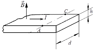 Рис. к зад. 4. Рис. к зад. 5. 5. Из начала координат со скоростью v0, направленной вдоль оси x, влетает протон в область, где созданы однородные параллельные оси y электрическое и магнитное поля с напряженностью E и индукцией B (см. рис.). Определите координату yn частицы в момент времени, когда она в n-й раз пересечет ось y. (2004) 6. Незаряженный металлический цилиндр радиуса R вращается в магнитном поле с угловой скоростью w вокруг своей оси. Индукция магнитного поля направлена вдоль оси цилиндра. Каково должно быть значение индукции магнитного поля, чтобы в цилиндре не возникало электрическое поле? (2006). 7. По металлической ленте, толщина которой равна h, течет ток I. Лента помещена в однородное магнитное поле, индукция которого равна В и направлена перпендикулярно поверхности ленты (см. рис.). Определите разность потенциалов (jА - jС) между точками А и С ленты, если концентрация свободных электронов в металле равна n. (2008, 2009).