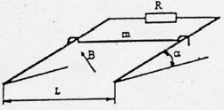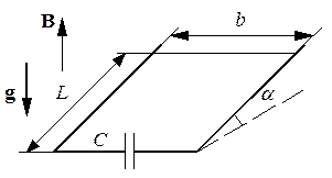 Рис. к зад. 11. Рис. к зад. 12. 12. По двум гладким медным шинам, установленным под углом a к горизонту, скользит под действием силы тяжести медная перемычка массы m. Шины замкнуты на сопротивление R. Расстояние между шинами L. Система находится в однородном магнитном поле с индукцией B, перпендикулярном плоскости, в которой перемещается перемычка (см. рис.). Сопротивления шин, перемычки и скользящих контактов, а также самоиндукция контура пренебрежимо малы. Найдите установившуюся скорость перемычки. (2006) 13. По двум параллельным металлическим направляющим, наклоненным под углом a к горизонту и расположенным на расстоянии b друг от друга, может скользить без трения металлическая перемычка массой m. Направляющие замкнуты снизу на незаряженный конденсатор емкостью C, и вся конструкция находится в магнитном поле, индукция которого B направлена вертикально. В начальный момент перемычку удерживают на расстоянии L от основания «горки» (см. рис.). Определите время t, за которое перемычка достигнет основания «горки» после того, как ее отпустят. Какую скорость vк она будет иметь у основания? Сопротивлением направляющих и перемычки пренебречь. (2004).