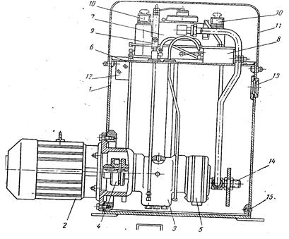 В цилиндре движется дифференциальный плунжер с прикрепленным к нему штоком. Плунжер и шток уплотняются с гидроцилиндром манжетами. Шток соединен с подвижной плитой. Она перемещается по направляющим, прикрепленным к стойкам. К подвижной плите и рабочемустолу прикреплены стальные рабочие плиты с пазами для крепления пуансона и матрицы пресс-формы. В нижней части рамы пресса расположен выталкиватель, состоящий из гидроцилиндра, дифференциального плунжера с уплотняющими манжетами и штока. Для ограничения хода подвижной плиты и штока выталкивателя предусмотрены конечные выключатели. Главный гидроцилиндр и гидроцилиндр выталкивателя соединены с индивидуальным гидроприводом (рис. 3.12). Он состоит из масляного бака, куда заливается масло через фильтр, двух насосов – поршневого высокого давления и шестеренного низкого давления, электродвигателя и гидравлической аппаратуры управления. Она состоит из гидропанели, регулятора промежуточного давления и предохранительного клапана. Клапанами, находящимися в гидропанели, управляют электромагниты. Управление гидропрессами сводится к распределению рабочей жидкости по цилиндрам пресса при помощи различного вида распределителей (дистрибуторов). При этом управление может быть ручным, полуавтоматическим и автоматическим. Распределители изготовляются трех видов: шпиндельные, золотниковые и клапанные. В прессах с индивидуальным гидроприводом применяются клапанные дистрибуторы для автоматического управления прессом. Работой клапана управляет соленоидная электромагнитная катушка.