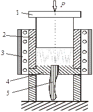 Подготовка пресс-сырья. Приемы подготовки зависят от условий его хранения. Подготовка начинается с его разборки по партиям, имеющим близкие технологические свойства и определенные при входном контроле. Это необходимо для сокращения потерь времени и сырья при перенастройке технологического процесса производства, связанного с переходом на переработки другой партии сырья. Хранят пресс-материалы не более 3 месяцев в герметичной таре. Если хранение было в не отапливаемых помещениях, особенно зимой, то перед переработкой материал выдерживают в помещении цеха, пока он не приобретет температуру цеха. При необходимости проводят подсушку до требуемого содержания влаги и летучих веществ или в течение 12¸ 36 ч при температуре цеха или в сушильной камере в течение 1¸ 3 ч при 40¸ 60 0С. Волокниты перед переработкой разрыхляют. Растаривание пресс-сырья ведут либо вручную, либо с применением средств малой механизации. Таблетирование и червячная пластикация рассмотрены в теме 2 настоящей дисциплины. Для уменьшения удельного объема волокнитов, особенно стекловолокнитов, когда в производстве нет червячных пластикаторов, их подвергают жгутированию. Исходную рыхлую пресс-массу продавливают через отверстие определенного сечения и режут на заготовки. Для этого на гидропрессе устанавливают поршневую фильеру, которую разогревают до температуры размягчения пресс-материала (рис. 3.25).