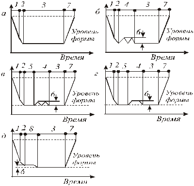 Рис. 3.44. Диаграммы различных режимов прессования реактопластов: а – без подпрессовки; б – подпрессовка “без паузы”; в – подпрессовка “после паузы”; г – подпрессовка “с паузой”; д – режим “подогрев пресс-материала в пресс-форме”; 1 – ход на низком давлении (холостой ход); 2 – ход на высоком давлении (рабочий ход); 3 – выдержка под давлением; 4 – подпрессовка; 5 – пауза перед подпрессовкой; 6 – высота подпрессовок; 7 – разъем пресс-формы; 8 – подогрев пресс-материала