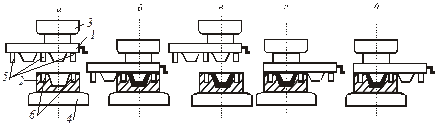 Рис. 3.46. Схема прессования двухцветных изделий: а – первая загрузка; б – первая выдержка; в – вторая загрузка; г – вторая выдержка; д – извлечение готового изделия; 1 – пуансон; 2 – матрица; 3 – подвижная плита пресса; 4 – станина пресса; 5 – направляющие колонки пресс-формы; 6 – втулка направляющих колонок