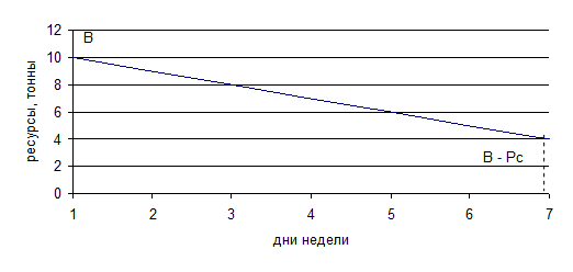 Рис.2. Динамика расхода ресурсов (разовая поставка, дефицит есть) 4. Определим расходы Сд из-за дефицита, в случае доставки сырья транспортом поставщика: если дефицита нет, то Сд = 0; если предприятие работает в условиях дефицита, расходы из-за дефицита определим по формуле: С1д = Сп · (7 - tд), где Сп – потери от дефицита, у.д.е./сутки; 7 – t д – количество дней недели, когда на предприятии отсутствует сырье. Для нашей задачи: С1д = 10 · (7 – 5) = 20 у.д.е. 5. Определим общие затраты предприятия при доставке сырья транспортом поставщика: С1полн = С1тр + С1хр + С1д , где С1тр – стоимость доставки сырья поставщиком. Для нашей задачи: С1полн = 17 + 30 + 20 = 67 у.д.е. 6. Определим наличие дефицита сырья в случае использования собственного транспорта предприятия. Если РC > C · Д, где С – интенсивность доставки сырья собственным транспортом, тонн/сутки; Д – количество поставок собственным транспортом, то предприятие будет испытывать дефицит сырья. Если РC < C · Д, то дефицита сырья не будет. Для нашей задачи (РC = 14 т) > (C · Д = 6 · 2 = 12 т), т.е. предприятие и в этом случае будет работать в условиях дефицита сырья. 7. Определим расходы предприятия, связанные с хранением сырья, доставленного собственным транспортом предприятия. Если дефицита сырья нет, то расходы на хранение определяются по формуле: С2хр = С х0 · S с р, где S с р – среднее количество хранимого на складе сырья. Для определения S с р необходимо построить график динамики сырья на складе (рис.3) и определить площадь под ломаной прямой.