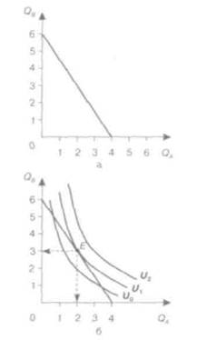 Рис. 4.5. Бюджетная линия и равновесие потребителя у ординалистов: а — линия бюджетного ограничения потребителя; б — равновесие потребителя (максимизация полезности) Теперь определим, сколько товаров А и В максимально может позволить себе потребитель на доход в 120 руб. Для этого наложим бюджетную линию на карту кривых безразличия потребителя (рис. 4.5, б). Мы видим, что бюджетная линия некоторые кривые безразличия пересекает, а с некоторыми не имеет общих точек. Она касается лишь одной кривой безразличия, с которой имеет одну общую точку Е в месте касания. На этом случае остановимся подробнее, так как кривая безразличия, которой касается бюджетная линия, соответствует максимально высокому уровню полезности, достижимому при данном ограничении бюджета. Такая ситуация называется равновесной. Потребитель находится в равновесии, так как в общей точке Е две функции равны между собой. В этой ситуации оптимально расходуется бюджет потребителя и он получает максимально достижимый уровень полезности от сочетания благ: двух ед. блага А и трех ед. блага В.