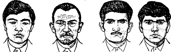 Д.Монгольський тип представника населення Центральної та Середньої Азії; Е.Тип обличчя представника населення Уралу та Волги; Ж.Європейський південний (кавказький) тип обличчя; З.Європейський тип обличчя представника населення Середньої Азії.