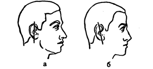 Мочка по прикріпленню до щоки: а-відокремлена; б-злита.