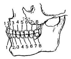 Зубний апарат людини(найменування зубів): 1-центральний різець; 2-боковий різець; 3-ікло; 4-перший малий корінний зуб; 5-другий малий корінний зуб; 6-перший великий корінний зуб; 7-другий великий корінний зуб; 8-третій великий корінний зуб (“зуб мудрості”).