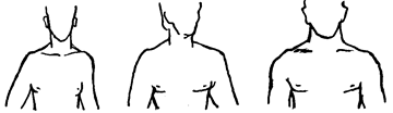 Плечі за нахилом: а-покаті; б-горизонтальні; в-припідняті. Груди. Груди описують за шириною та контуром. За шириною груди бувають вузькі, середньої ширини та широкі. За контуром (вид збоку) груди характеризують як впалі, плоскі, випуклі. Як особливості вказують на виступи ключиць, килеєватість, тощо.
