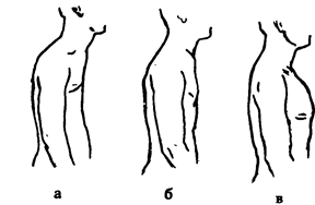 Груди: а-впалі; б-плоскі; в-випуклі. Спина. Спина описується за шириною та контуром (вид збоку).