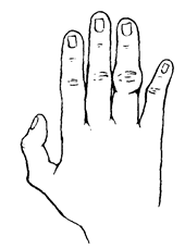 Кисть руки та пальці: кисть довга, вузька, пальці середньої довжини, середньої товщини, вказівний та середній пальці прямі, великий зведений, безіменний з потовщенням у суглобі, мізинець викривлений на зовні, нігті вузькі прямокутні.