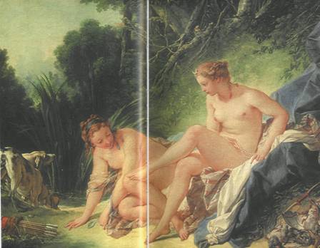 Справа – это я, Диана‑ Лукреция. Да, это я, богиня лесов и рощ, плодородия и деторождения, покровительница охоты. Греки называют меня Артемидой, я в родстве с Луною и прихожусь Аполлону сестрой. Среди тех, кто поклоняется мне, больше всего женщин и простолюдинов. По всей империи стоят воздвигнутые в мою честь храмы. А справа от меня склонилась к моим ногам Юстиниана, моя служанка, моя любимица. Мы только что искупались и сейчас предадимся любви. Этого зайца, этих куропаток и фазанов я застрелила сегодня на рассвете: Юстиниана извлечет стрелы, вымоет их и уложит в колчан до следующей охоты. А с этими собаками я охочусь редко, на такую дичь, как сегодня, – никогда: побывав в их клыкастых пастях, добыча становится несъедобной. Эти легавые – так, для красоты. Нынче вечером мы с Юстинианой отужинаем нежным ароматным мясом, приправленным редкими душистыми травами; мы запьем его вином из Капуи; мы будем есть до отвала, пить допьяна. Я знаю толк в наслаждениях. На протяжении многих веков неустанно развиваю я эту мою способность и могу сказать без похвальбы, что достигла совершенства. Я овладела искусством добывать нектар наслаждения из всех – даже подгнивших – плодов бытия. А главного героя нет на полотне. Верней сказать, не видно. Он спрятался где‑ то рядом, он притаился за деревьями и неотрывно смотрит на нас. Он замер в столбняке обожания, присев на корточки в лесной чащобе, и его красивые глаза, цветом подобные рассветному небу в полуденных краях, широко раскрыты, а круглое лицо разрумянилось в страстном томлении. Листочки и веточки запутались в его золотистых кудрях, незрелая отроческая плоть напряжена и воздета, как копье. Да, он где‑ то здесь, он с жадностью ловит и впитывает каждое наше движение, каждое слово, делая нас предметом своих целомудренно ребяческих грез. Его присутствие забавляет нас и придает нашим играм особую порочность. Он пасет коз, играет на свирели и зовется Фонсином. Однажды, накануне августовских ид, когда я гнала оленя, Юстиниана обнаружила этого пастушка. Ни на миг не отрывая от меня глаз, ошалев, спотыкаясь, он крался за мною. Служанка говорит, что, увидев меня – луч солнца окружил мои волосы огненным сиянием, воспламенил мои глаза, каждый мускул моего тела был напряжен перед тем, как пустить с тугой тетивы стрелу, – мальчик расплакался. Когда же Юстиниана принялась утешать его, то догадалась, что плачет он от счастья. " Безупречность твоего тела до срока сделала для него внятным язык любви, – философствовала Юстиниана, пересказав мне этот случай. – Твоя красота приковала его к месту, как приковывает птичку взгляд змеи. Сжалься над ним, Диана‑ Лукреция. Почему бы этому пастушку не принять участие в наших играх? Мы потешим его и потешимся сами". Так мы и поступили. Юстиниана в той же мере, что и я, а быть может, и еще щедрее, одарена от природы способностью искать и находить наслаждение и никогда не ошибается в том, что может подарить его. И эта ее способность мне милей даже, чем стройная крутизна ее бедер и чем шелковистая поросль на лобке, которая приходится мне так по вкусу: более всего остального люблю я стремительность ее выдумки, безошибочность ее чутья, отыскивающего в нашем бурном мире источники все нового и нового наслаждения. С той поры мы допустили его к нашим забавам, и, хоть минуло уже немало дней, игра все ника
