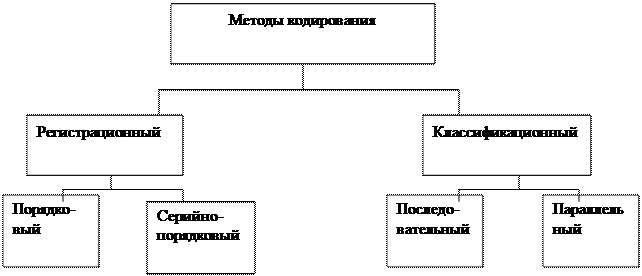Регистрационное кодирование осуществляется порядковым номером. Это наиболее простой метод кодирования с последовательной порядковой (числовой) регистрацией объектов. Кодовыми обозначениями в этом случае служат числа натурального ряда. Регистрационный метод обеспечивает полную идентификацию объектов, но не является информативным, так как не отражает признаков, присущих множеству. Порядковая регистрация реализуется при образовании артикулов некоторых товаров (хлопчатобумажных тканей, керамической посуды). Разновидностью регистрационного метода кодирования служит серийно-порядковый метод. По этому методу кодовыми обозначениями служат числа натурального ряда с присвоением отдельных серий этих чисел объектам кодирования со сходными признаками. Классификационный метод кодирования применяется с учетом особенностей классификации объектов. По этому методу кодирования каждый знак кода обозначает определенную классификационную группировку. Классификационные методы кодирования разделяются на последовательный и параллельный. Последовательный метод чаще всего используют при иерархической классификации, когда множество разделяется на подмножества в нужной последовательности. При этом в кодовом обозначении последовательно указываются признаки, характеризующие объекты кодирования классификации, что обеспечивает их идентификацию. К недостаткам этого метода кодирования следует отнести зависимость кода от установленных правил классификации, необходимость иметь резервные коды на случай включения дополнительных объектов, невозможность изменения состава и количества признаков, которыми идентифицируется объект. Пример последовательного кодирования — деление товаров на классы и подклассы, используемое в Общероссийском классификаторе продукции. Параллельный метод чаще всего используется при фасетной классификации объектов, когда коды присваиваются фасетам и признакам независимо друг от друга. В этом случае структура кодового обозначения определяется фасетной формулой. Данный метод эффективен при машинной обработке и решении таких задач, характер которых часто меняется, и в тех случаях, когда необходимо анализировать различные множества объектов. Этот метод обеспечивает возможность независимого изменения и дополнения характеристик объектов и их различных сочетаний, необходимых для решения конкретных задач. К недостаткам параллельного метода следует отнести некоторую громоздкость фасетных формул и избыточную емкость кодов. Пример параллельного метода — кодирование групп, видов и разновидностей товаров в ОКП.