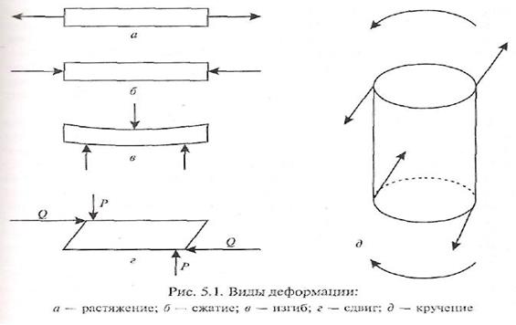 Деформации изгиба - это вид деформации, характеризующийся искривлением оси или срединной поверхности деформируемого объекта под действием внешних факторов. Они проявляются при эксплуатации одежды, обуви, строительных материалов. Если на середину бруса, лежащего на двух опорах, действовать сосредоточенной нагрузкой, то в выпуклой части наблюдается деформация растяжения, а в вогнутой — деформация сжатия; в зоне нейтрального слоя деформации нет. Деформация изгиба характеризуется стрелой прогиба. При этом напряжение сжатия в вогнутой части бруса постепенно уменьшается до нейтрального слоя, в котором не наблюдается никаких напряжений. Ниже этого уровня возрастает напряжение растяжения. Значения напряжений растяжения и сжатия зависят от изгибающего момента, модуля упругости материала, места расположения и удаления определенной части от нейтральной линии и от радиуса кривизны. Деформация в слое, отстоящем от нейтрального слоя, прямо пропорциональна этому расстоянию и обратно пропорциональна радиусу кривизны нейтрального слоя. Если слой имеет большую толщину, а радиус кривизны мал, возникают значительные напряжения и материал разрушается. Деформации сдвига проявляются в местах соединений деталей, когда две равные силы (Q) действуют в противоположном направлении и расположены в двух близких поперечных сечениях (см. рис. 5.1, г). Деформация сдвига определяется углом сдвига. Если сдвиг частиц тела происходит в одной плоскости, то деформация называется срезом. Деформация сдвига частично связана с деформациями кручения и изгиба и, как правило, предшествует им. Значение, на которое сечение сместилось относительно соседнего, называется абсолютным сдвигом. Деформация кручения — вид деформации, характеризующийся взаимным поворотом поперечных сечений стержня, вала, нити под влиянием моментов (пар сил), действующих в противоположных направлениях в плоскости этих сечений. Деформация кручения сообщается волокнам и нитям. Скрученность характеризуется круткой, углом наклона волокон или нитей к продольной оси и направлением крутки (правая, левая). Напряжение при кручении в определенной точке стержня пропорционально ее расстоянию до центра сечения. Наибольшее напряжение испытывают поверхностные слои материала, а наименьшее — внутренние. По значению деформации судят о механических свойствах материалов и изделий: пластичности, упругости, прочности, твердости, хрупкости, выносливости, износостойкости и др. Пластичность — свойство твердых тел необратимо деформироваться под действием механических нагрузок. Пластичность определяет возможность технологических операций обработки материалов давлением (ковки, проката и др.). Упругость — свойство материала или изделия полностью восстанавливать сразу после разгрузки взаимные положения частиц (размеры тела), которые были до нагрузки. Показателем, характеризующим способность материала упруго сопротивляться нагрузкам, является модуль упругости Е (МПа). Прочность — способность материала выдерживать действие внешних факторов до предельного состояния (разрушения). Как известно, под действием нагрузки в материале возникают внутренние напряжения, которые могут привести к разрушению или появлению в материале недопустимой пластической деформации (предельного состояния). Исходя и