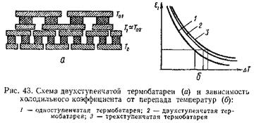 Поэтому на практике используются только двух- и трехступенчатые термоэлектрические батареи. Преимущества двух- и трехступенчатой термоэлектрической батареи проявляются больше при малых значениях холодильного коэффициента. Поэтому в двухступенчатых термобатареях с успехом могут быть использованы недорогие полупроводниковые материалы с меньшей величиной Z. Поскольку затрачиваемая мощность в многоступенчатых термоэлектрических батареях значительно увеличивается, то применение двух- и трехступенчатых термобатарей может быть оправдано только в тех случаях, когда требуется получить значительную глубину охлаждения в малых объемах без учета потребляемой мощности (микрохолодильники и микротермостаты для различных отраслей науки и техники). В бытовых же холодильниках объемом (5 - 50 дм3) температуру холодных спаев термобатареи достаточно иметь в пределах О - минус 10° С при холодопроизводительности до 11, 63 Вт/ч. При таких параметрах применение многокаскадных термоэлектрических батарей экономически нецелесообразно.