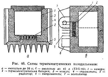 Начало опытного проектирования бытовых термоэлектрических холодильников можно отнести к 1957 г., когда на базе холодильника «Ока» был спроектирован и изготовлен холодильник ТЭХ-57. Термобатарея этого холодильника состояла из 45 термоэлементов и располагалась внизу задней стенки камеры емкостью 100 дм3. В период с 1959 по 1961 г, было изготовлены термоэлектрические холодильники «Айсберг» объемом 90 и 120 дм3 и «Фонтан» объемом 20 дм3. В холодильнике «Фонтан» горячие спаи термобатареи охлаждались водой, циркуляция которой осуществлялась насосом увлажнителя воздуха УВ-1. В 1964 г. был сконструирован холодильник такого же типа ТЭХ-20 настенный. Охлаждаемая вода в нем разбрызгивалась на горячие спаи внутри корпуса. В 1965 г. на базе холодильника «Днепр» объемом 100 дм3 сконструирован ТЭХ-100. Его холодильная камера изготовлена из алюминия толщиной 1, 5 мм. Термобатарея состояла из 15 термоэлементов и распологалась в нижней части камеры; охлаждение горячих спаев — через радиатор, воздушное; мощность, потребляемая из сети, — 56 Вт. В 1966 г. во ВНИХИ были сконструированы холодильники ТЭХ-12 и ТЭХ-40 с охлаждением спаев вентиляторами. При номинальном температурном режиме