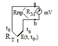На приведенной схеме (рис.2.4.2) источник постоянного напряжения Рассмотрим соотношение токов в измерительной цепи. Термопара подключается таким образом, что токи