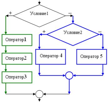 | если условие 1 то если условие 2 то оператор 4 иначе оператор 5 иначе начало оператор 1 оператор 2 оператор 3. конец