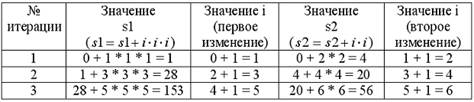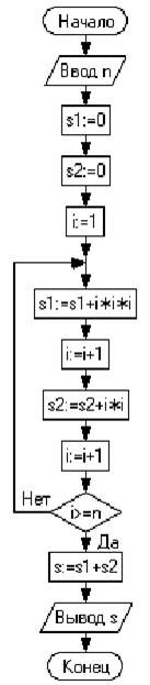 | Решение: Данный алгоритм содержит цикл с постусловием. В результате выполнения алгоритма выводится значение суммы квадратов четных и кубов нечетных натуральных чисел от 1 до На первом шаге вводится значение переменной На следующем шаге присваиваются значения переменным Далее выполняется цикл с постусловием, в котором вычисляется значение суммы кубов нечетных натуральных чисел затем увеличивается значение счетчика цикла далее вычисляется значение суммы квадратов четных натуральных чисел и снова увеличивается значение счетчика цикла Данные команды будут выполняться 3 раза, пока не выполнится условие при значениях от 1 до с шагом 1. Итерации цикла будут иметь следующий вид: На следующем шаге вычисляется значение суммы На последнем шаге выполняется вывод значения переменной В результате выполнения алгоритма переменная примет значение, равное 209.