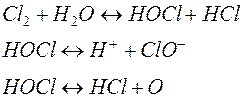 Обеззараживанием воды называется процесс её очистки от патогенных микроорганизмов в процессе водоподготовки. Существует два основных метода обеззараживания: - реагентный, при котором вода обрабатывается сильными окислителями (озоном, хлором, хлораминами, хлорной известью, перманганатом калия), солями меди или серебра; - безреагентный, при котором вода подвергается воздействию ультрафиолетового облучения (УФО), ультразвука или высокой температуры (кипячение воды). Сущность процесса обеззараживания заключается в окислении веществ, входящих в состав протоплазмы клеток, что приводит к инактивации ферментов и гибели бактерий. При полной очистке поверхностных вод обеззараживание необходимо всегда, при использовании подземных вод – только тогда, когда микробиологические свойства воды не соответствуют требованиям СанПиН 2.1.4.559-96 (в случае централизованного водоснабжения) и СанПиН 2.1.4.544-96 (для источников нецентрализованного водоснабжения). Для профилактического обеззараживания и обработки воды в аварийных ситуациях процесс обеззараживания необходим на всех станциях подготовки хозяйственно-питьевых вод. Часть окислителей при подаче в воду расходуется на окисление некоторых органических и минеральных веществ, что улучшает органолептические свойства воды (цвет, запах, привкус). Наличие взвешенных веществ в воде препятствует контакту клеток микроорганизмов с реагентом и тем самым снижает эффективность обеззараживания. Наиболее распространенным методом обеззараживания является хлорирование – обработка воды одним из хлорсодержащих соединений: жидким хлором ( В процессе обеззараживания воды хлором протекают следующие реакции: