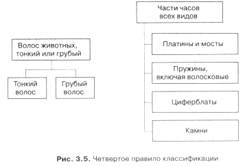 В обоих примерах на одном этапе классификации наблюдается объединение нескольких оснований (материал и наличие электрического обогрева для одеял; место установки и пол потребителя для часов). В первом случае это просто затрудняет понимание классификации, а во втором случае приводит к потерям группировок, отличающихся по месту установки (настенные, настольные и т. п.). Четвертое правило классификации – деление должно быть соразмерным – объем делимого понятия должен быть равен объединению объемов членов деления. На рис. 3.5 сумма понятий «тонкий волос» и «грубый волос» равна объему делимого понятия. В случае с часами объем делимого понятия шире, чем сумма понятий, полученных в результате деления. Во избежание этой ошибки необходимо добавить еще один член деления - «прочее». Этот метод позволяет предсказывать существование ранее неизвестных объектов или создавать новые.