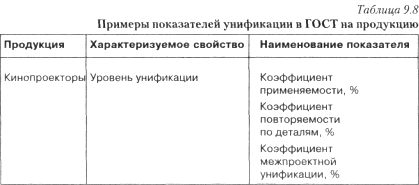 В зависимости от области проведения унификация изделий может быть межотраслевой, отраслевой и заводской. В зависимости от методических принципов осуществления унификация может быть внутривидовой (семейств однотипных изделий) и межвидовой или межпроектной (узлов, агрегатов, деталей разнотипных изделий). Степень унификации характеризуется уровнем унификации продукции – насыщенностью продукции унифицированными, в том числе стандартизированными, деталями, узлами и сборочными единицами. Примеры показателей унификации – в табл. 9.8.