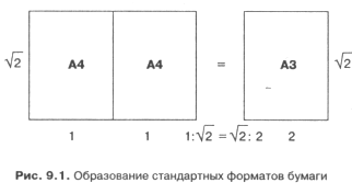 В системе размеров бумаги ISO каждый лист бумаги имеет ширину, равную результату деления его длины на корень квадратный из двух (1: 1, 4142). Это отношение идеально описывает размеры бумаги. Если поместить два листа бумаги, сложив их один за другим встык по длине или разрезать лист поперек на две равные части, отношение ширины к длине останется неизменным. Образование стандартных форматов бумаги показано на рис. 9.1. Международный стандарт ISO 216 описывает А-серию размеров бумаги следующим образом: Длина листа любого формата определяется исходя из ширины, умноженной на корень квадратный из двух (1, 4142). Площадь листа формата АО равна 1 м2. Формат А1 получается путем разрезания формата АО на две равные части, таким образом А1 имеет длину, равную ширине АО, а по ширине равен половине длины АО. Все последующие форматы серии А получаются в результате разрезания на две равные части листа большего формата по линии, параллельной более короткому краю.