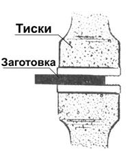 В тех случаях, когда заготовку невозможно закрепить в тисках, ее обрабатывают на плите (рис. слева). Зубило ставят вертикально на разметочную риску и наносят удары. После каждого удара зубило перемещают на половину режущей кромки. Благодаря этому облегчается установка зубила в правильное положение и образуется непрерывный разрез. В заготовке большой толщины разметочную риску наносят с противоположных сторон. Сначала надрубают примерно до половины толщины листа с одной стороны, затем — с другой.