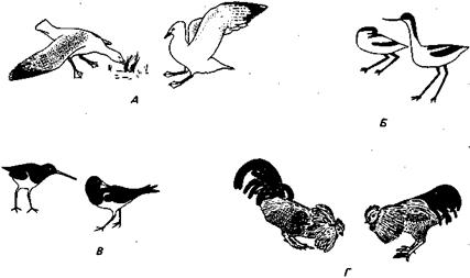 Рис. 47. Различные виды смещенной активности, функционирующие как угрожающие демонстрации. А. Дерганье травы (смещенный сбор гнездового материала) у серебристой чайки. Б. Смещенное засыпание у шилоклювки. В. Смещенное засыпание у кулика-сороки. Г. Смещенное питание у домашнего петуха. Анализ обстоятельств, приводящих к угрожающему поведению, показал, что оно проявляется, когда у агента одновременно активируются два побуждения — к нападению и бегству. В случае территориальных конфликтов легко понять, как это происходит. Поскольку в пределах индивидуальной территории чужак вызывает нападение ее хозяина, а вне ее — его бегство, столкновение с соперником как раз на границе собственных владений одновременно стимулирует и агрессивность, и страх. Это приводит к «напряжению», т. е. сильной активации двух антагонистических тенденций, которая в подобных условиях находит выход в так называемой «смещенной активности». Угрожающая поза трехиглой колюшки — ее пример. Когда два самца вступают в упорную борьбу, их любопытное положение вниз головой завершается рытьем песка — первой фазой строительства гнезда. В таком поведении находит выход столкновение побуждений к нападению и бегству, двигательные программы которых антагонистичны и не могут реализоваться одновременно. Другие виды при пограничных конфликтах ведут себя сходным образом, хотя смещенная активность у разных животных неодинакова (рис. 47). Так, журавли и скворцы начинают чистить оперение, синицы как бы клюют корм, а многие кулики даже принимают позу сна! [78] Возвращаясь к колюшке, следует отметить, что ее угрожающая демонстрация не просто «смещенное» рытье песка. Обычно самцы поворачиваются друг к другу широкой стороной и оттопыривают один или оба брюшных шипа. Это часть поведенческой программы самих активированных побуждений — действие по защите от врага. Любая колюшка делает так при столкновении как с соперником, так и с хищником типа щуки. В угрожающей позе отражается и стремление атаковать: самцы яростно кусают песок — гораздо сильнее, чем при обычном рытье, когда они готовят место для гнезда. Эти укусы напоминают настоящую атаку на соперника; рыба как бы показывает, что она способна сделать с другой, если «соберется с духом». Сходное угрожающее поведение наблюдается и у серебристой чайки. В гл. 1 описано, как при столкновении с соперником самцы выдергивают из земли траву или мох. Это — смещенный сбор гнездового материала, используемый в качестве угрозы. Он отличается от настоящего: угрожающая сопернику чайка клюет землю гораздо энергичнее, чем требуется для того, чтобы поднять соломинку, она изо всех сил дергает за корни, пучки травы и т. п. В этом опять же легко угадать ее действия в отношении другой чайки, если бы произошла настоящая драка. Такого рода смещенная активность возникает только в случае очень сильного напряжения. В смягченной форме конфликта угрожающее поведение обычно выглядит сочетанием поведенческих элементов, связанных с обоими вызывающими его побуждениями. Колюшка мечется вперед-назад, чередуя нерешительные атаки и отступления. У серебристой чайки элементы обоих побуждений сочетаются в позе: вытягивание шеи, опускание вниз клюва и приподнимание крыльев — часть боевых действий: подготовка к клеванию и битью крыльями соперника. Когда тот близко