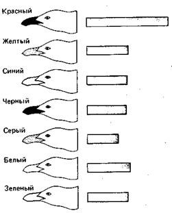 Рис. 49. Модели головы серебристой чайки с клювами разного цвета. Красный клюв вызывает больше реакций, чем любой другой, в том числе и желтый. Способность реагировать на сигналы специально изучалась во многих случаях. Некоторые из результатов уже были описаны в предыдущих главах. Рассмотрим теперь более подробно выпрашивающее поведение птенца серебристой чайки, поскольку в данном случае точно известно, на какие стимулы он реагирует. Можно стимулировать выпрашивание, предъявляя ему плоские картонные макеты родительской головы (вкладка 6). На конце клюва у взрослой серебристой чайки находится красное пятно, четко выделяющееся на желтом окружающем фоне. Когда этого пятна на [80] макете нет, птенец реагирует гораздо слабее, чем в случае «нормального» макета с пятном (рис. 48). Если предъявлять их по очереди нескольким птенцам, среднее число реакций на макет без пятна оказывается в четыре раза меньше. Если это пятно не красное, стимулируется промежуточное число реакций. Оно зависит от степени контраста между цветом пятна и фона. Аналогичным образом, т. е. сравнивая реакции птенца на разные макеты, можно изучить влияние желтой фоновой окраски клюва. Удивительно, но от нее поведение птенцов почти не зависит, за исключением того, что на красный клюв они реагируют вдвое чаще, чем на любой другой (рис. 49). Клюв естественного желтого цвета вызывает не больше реакций, чем белый, черный, зеленый или синий. Окраска головы также не играет роли: можно было бы ожидать, что белая голова вызовет больше реакций, чем черная или зеленая, но это вовсе не так. Не существенна и форма головы; неважно даже, есть ли она вообще — был бы клюв. Однако птенцы прекрасно видят голову родителя, поскольку случайно могут клюнуть в основание клюва или даже в красное веко кормящей тики. Когда они голодны, для них существует только одно — родительский клюв с красным пятном. Кроме того, он должен быть тонким и длинным, направленным вниз, находиться как можно ближе к птенцу и пониже над землей. Вот и все стимулы; остальное для птенца не имеет значения. Поведение и окраска родителей прекрасно удовлетворяют этим требованиям, так сказать, полностью соответствуя ожиданиям потомства. Взрослая чайка подходит к птенцу, предъявляет ему свой клюв в почти вертикальном положении вниз концом, на котором находится красное пятно. Это совпадение признаков родителей и стимулов, на которые реагирует птенец, удивительно, если вспомнить, что он «не знает», как выглядит родитель или как он себя ведет. У многих других изученных животных также наблюдалось, [81] что реагент, точно так же как и птенец чайки, отвечает всего на несколько стимулов, исходящих от агента. Уже говорилось, что агрессивность у зарянки вызывает в основном красная грудь сородича, а драка у колюшек возникает как реакция в первую очередь на красное брюхо другого самца. «Усы» самца золотого дятла значат для сородичей больше любого другого его признака и т. д. По-видимому, у таких цветов, форм, звуков, движений только одна функция — вызывать соответствующую реакцию другой особи. Впервые мысль о том, что социальные реакции часто запускаются как будто специально приспособленными для этого стимулами, была четко сформулирована Лоренцем. Такие признаки он назвал релизерами[2]. Лоренц описывает свою концепцию релизеров следующим образо