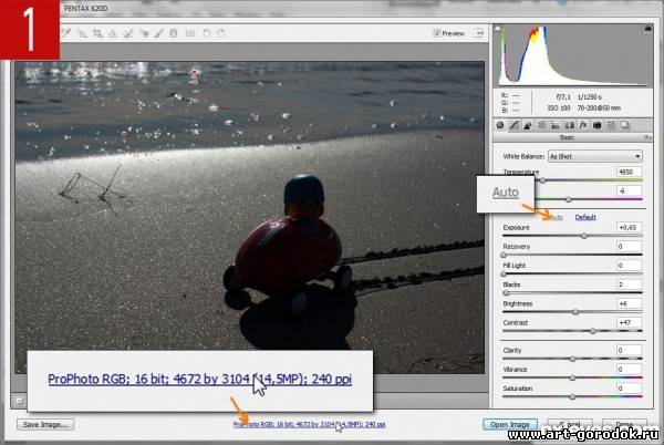 В этом уроке я расскажу вам, как улучшить фотографию за несколько минут при помощи корректирующих слоев. Для выполнения урока использовалась версия Photoshop CS5, но его также можно повторить и в более ранних версиях. Этот урок будет понятен даже неопытным пользователям программы, поскольку он достаточно прост, а техника, описанная в этом уроке основана на использовании корректирующих слоев и достаточно простых масок этих слоев. Лучше всего практиковаться на плохих снимках, и фотография, которую я использую в уроке как раз и является таковой — она была сделана в полдень против солнца. Датчики фотоаппарата «видят» не такую картину, как наши глаза, но, к счастью, у нас есть Photoshop, чтобы это исправить Фотографию, использованную в этом уроке, можно скачать отсюда Шаг 1 После того, как мы сделали снимок, давайте приступим к его обработке. Очень важно делать снимки в формате RAW (если ваш фотоаппарат вам это позволяет), т.к. Этот формат содержит гораздо больше информации, чем файл JPEG. Не будем подробно рассматривать предварительную коррекцию в Camera Raw, мне обычно хватает автоматической коррекции (" auto”). Основную обработку мы будем производить в Фотошопе. Но все же я хочу обратить ваше внимание на несколько параметров в окошке Camera Raw. Параметр " Recovery” используется для восстановления пересвеченных областей без деталей. Значение параметра " Blacks" должно находится в интервале от 0 до 5, чтобы не потерять детали в темных областях. При необходимости вы можете отрегулировать и другие настройки, к примеру, Резкость (" Sharpness"), уменьшить хроматические абберации (" chromatic aberrations"), но на данном этапе настройки, относящиеся к цветовой гамме, лучше не изменять. Одним из самых важных шагов на данном этапе является выбор формата экспортируемого изображения из Camera Raw. Для дальнейших манипуляций, нам потребуется формат ProPhoto RGB/16 bit(кликните по строчке, на которую указывает стрелка на рисунке ниже, чтобы задать этот формат), в котором сохранятся все данные из вашего RAW'a.