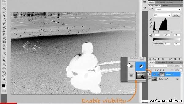 Кликните по иконке " Create new fill or adjustment layer" в нижней части панели слоев и выберите корректирующий слой " Levels" (" Уровни") Если переместить серый (средние тона) и белый (светлые области) ползунок влево, то темные области станут светлее. В данном случае белый ползунок был передвинут на отметку 175, а серый — на 1, 96. Не беспокойтесь о потери деталей в пересвеченных областях, мы поработаем над ними позже. На данном этапе вам нужно осветлить темные области на столько, на сколько вам нужно.