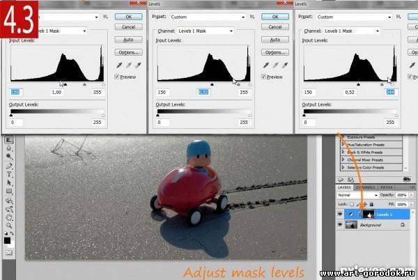 Кликните по маске корректирующего слоя " Levels" и осуществите настройку уровней, нажав Ctrl+L. Нам нужно повысить контраст маски слоя — сделать темные области черными (на маске), а светлые области — белыми. Таким образом мы увидим изменения в темных областях, а светлые области будут полностью восстановлены, поскольку на них не будет распространяться действие корректирующего слоя.