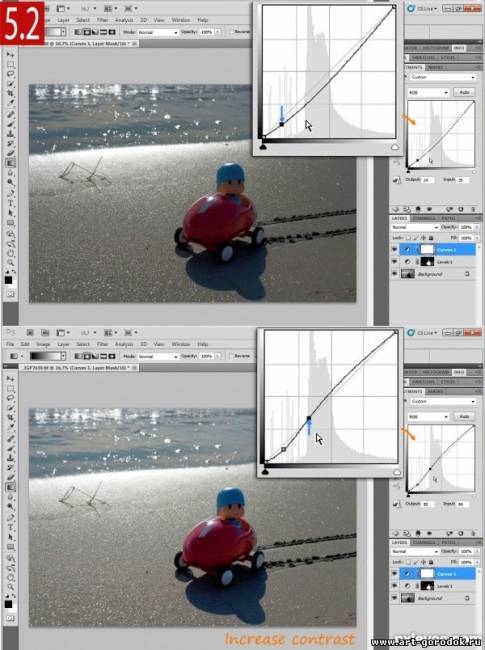 Настройки уровней для маски слоя: Шаг 5 Теперь фотография выглядит намного лучше, но тем не менее, она смотрится достаточно плоско. Поэтому нам нужно повысить контрастность. Для этого создайте корректирующий слой " Curves" (" Кривые"): В окошке с настройками корректирующего слоя " Curves" нам нужно привести кривую к S-образному виду, чтобы повысить контрастность изображения. Будьте аккуратны, нам нужно увеличить контраст без потери деталей в светлых и темных областях.