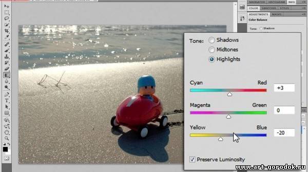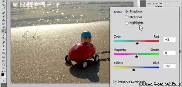 В темных областях (Shadows/Тени) мы уменьшим содержание синего цвета в тенях: